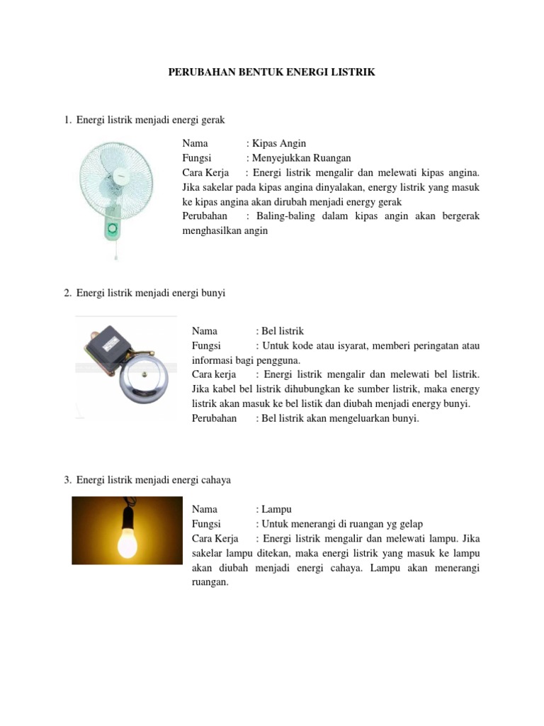 Bentuk energi yang mula mula hadir pada kipas angin menyala adalah energi listrik. Hal ini berbeda dengan lampu pijar yang hanya mengubah 10 energi listrik menjadi energi cahaya. Energi listrik menjadi energi kimia contohnya. Energi listrik menjadi energi cahaya.